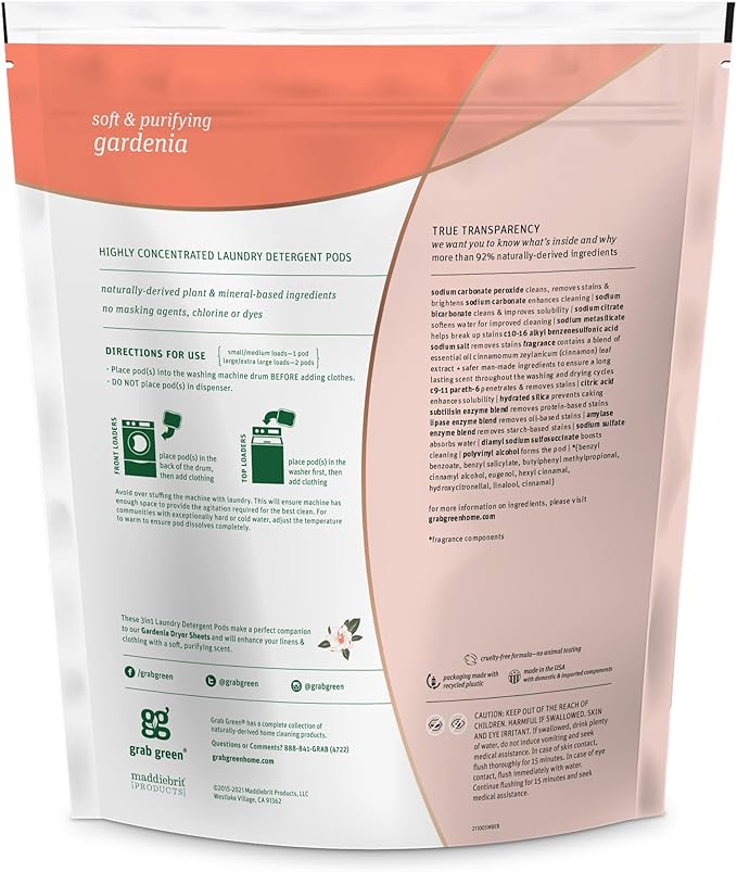 - Contains: 1- 60 Pod Bag of Grab Green Natural Gardenia 3in1 Laundry Detergent Pods. Our velcro closure bags are convenient and easy to use, no hassling with frustrating zip closures