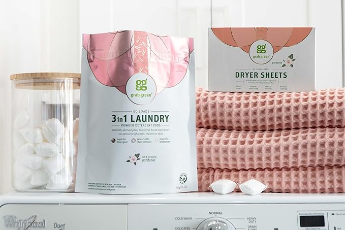 Grab Green 3-in-1 Laundry Detergent Pods, 60 Count, Gardenia Scent, Plant and Mineral Based, Superior Cleaning Power, Stain Remover, Brightens Clothes