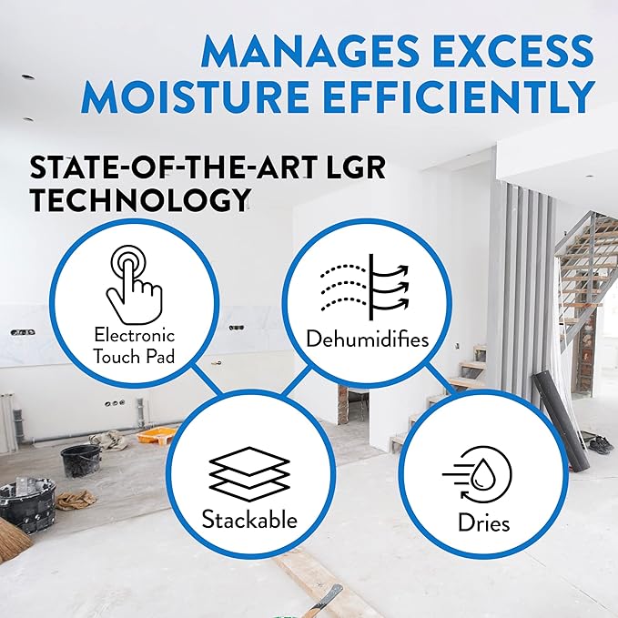 - High-performance dehumidifier with drain hose featuring state-of-the-art LGR technology that effectively removes excess moisture from a variety of spaces