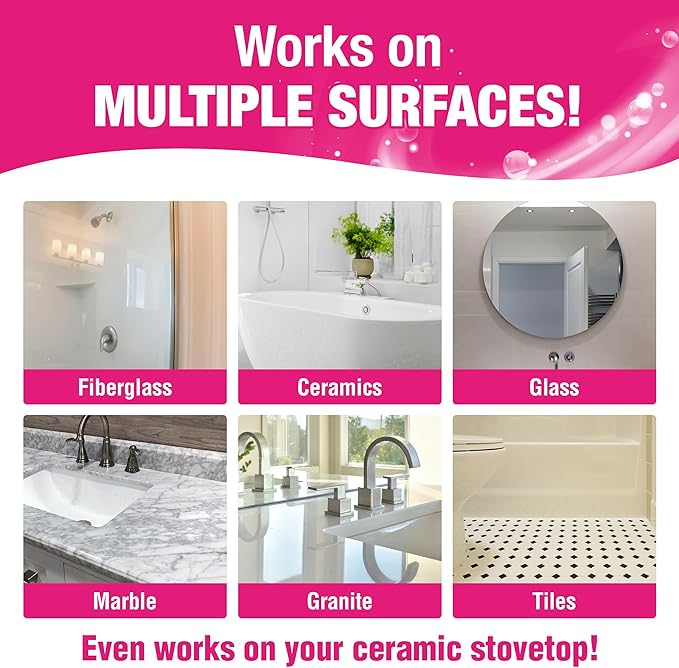 - Multi-surface cleaner - The no-scrub shower cleaning formula works great on any tub and shower surface like fiberglass, marble, granite, tile, glass doors, and even ceramic stovetops. It is versatile enough to not need any other household cleaners.