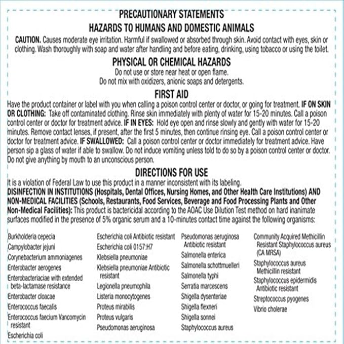 - BACTERIAL DISINFECTION PERFORMANCE: This product kills the following bacteria in 10 minutes on hard, non-porous surfaces with 5% soil: Human Immunodeficiency Virus Type 1 (HIV-1), Hepatitis B Virus and Hepatitis C Virus. Bordetella bronchiseptica, Enterobacteriaceae (Multi-Drug Resistant), Escherichia coli (Multi-Drug Resistant), Legionella pneumophila, Listeria monocytogenes, Pseudomonas aeruginosa (Multi-Drug Resistant), Salmonella enterica, Salmonella enterica Typhi, Shigella, Staphylococcus aureus Hospital Acquired Methicillin Resistant (Multi-Drug Resistant), Staphylococcus aureus, Methicillin Resistant, Staphylococcus epidermidis (MRSE) (Multi-Drug Resistant), Streptococcus pyogenes.