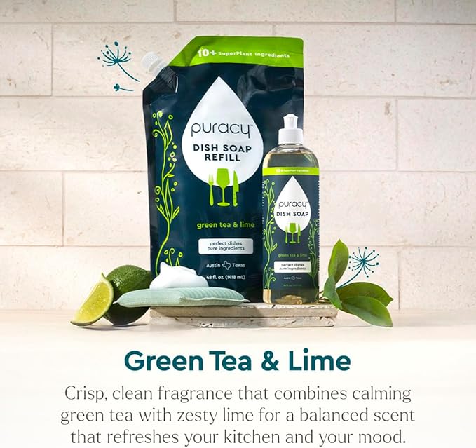 Puracy Natural Dish Soap - Skin-Softening Plant-Based Dishwashing Soap, Non-Toxic Dish Soap, Organic Liquid Dishwashing Detergent Soap (Green Tea & Lime, 16 fl oz)