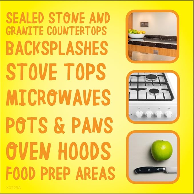 - WORKS ON - kitchen grease, grime, and baked-on food.