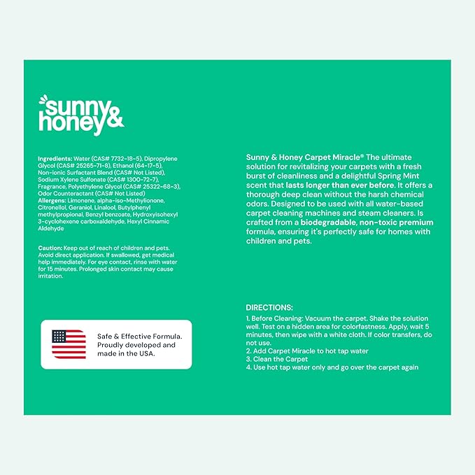 Sunny & Honey Carpet Shampoo & Cleaning Solution - 32 Fl Oz Spring Mint Scent - Pet Carpet Cleaner Machine Solution - Rug & Upholstery Cleaner - Stain Remover & Odor Deodorizer