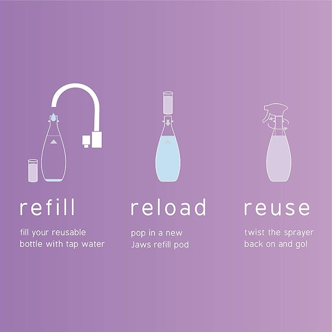- JUST ADD WATER: Fill the JAWS Reusable Bottle with water, insert the JAWS Refill Pod and apply the trigger sprayer to release concentrate.