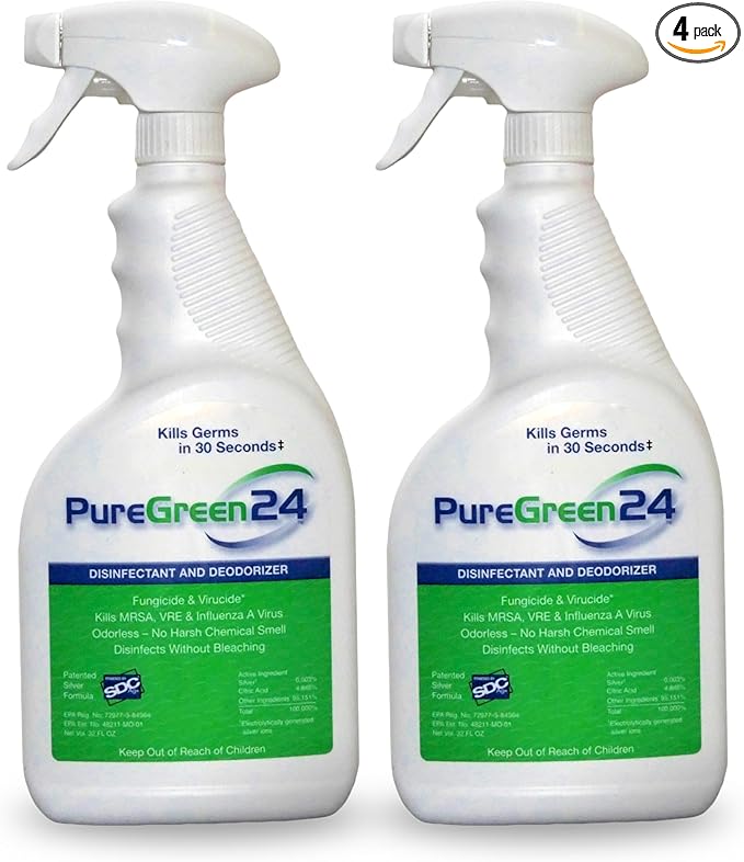 PureGreen24 Safe & Effective Disinfectant. Kills Deadly Germs including RSV COVID-19 Norovirus MRSA Staph 2025 flu Bird flu Contains no toxic chemicals odorless child & pet safe 2 32oz spray bottles