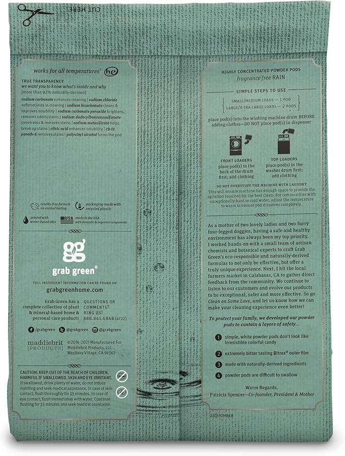 Grab Green Stoneworks Laundry Detergent Pods, Powered by Naturally-Derived Plant & Mineral-Based Powder Pods, Fragrance Free Rain, 50 Count (Pack of 1) Loads-EPA Safer Choice Certified