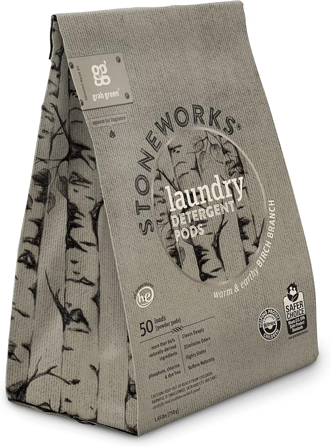 Grab Green Stoneworks Laundry Detergent Pods, Powered by Naturally-Derived Plant & Mineral-Based Powder Pods, Birch Branch, 50 Count (Pack of 1) Loads-EPA Safer Choice Certified