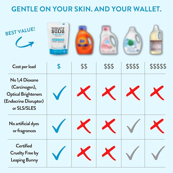 - FOR MOTHERS EVERYWHERE: Developed by a pediatric nurse & mom, Molly's Suds is made in the USA with clean ingredients that are certified cruelty-free by Leaping Bunny. Our laundy detergent leaves no residue and rinses clean. Septic and grey water safe. Available unscented or lightly scented so clothes smell fresh. Created for all mothers, babies, people, skin sensitivities, and the planet, joining cleaning power with compassion.