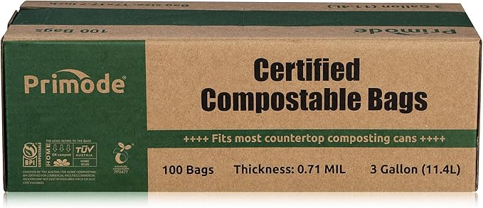 Primode Compostable Bags, 3 Gallon Food Scraps Yard Waste Bags, 100 Count, Extra Thick 0.71 Mil. ASTMD6400 Compost Bags Small Kitchen Trash Bags, Certified By BPI And TÜV AUSTRIA