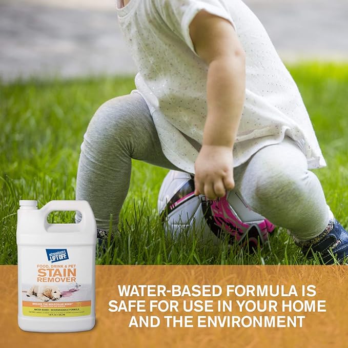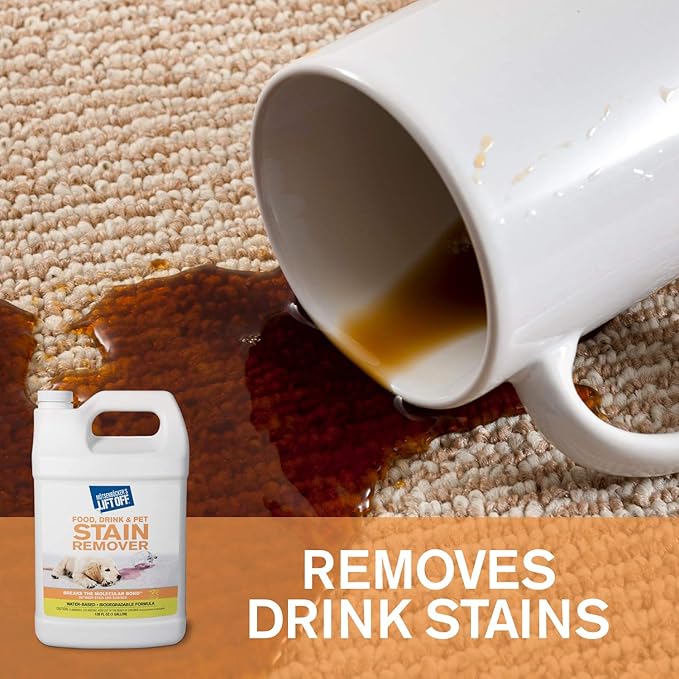 - WORKS ON MULTIPLE SURFACES: Lift Off’s Food, Drink, and Pet Stain Remover is safe to use on carpeting, indoor and outdoor furniture, linens, and fabrics including the interior of your car! Great for at home or at the office.