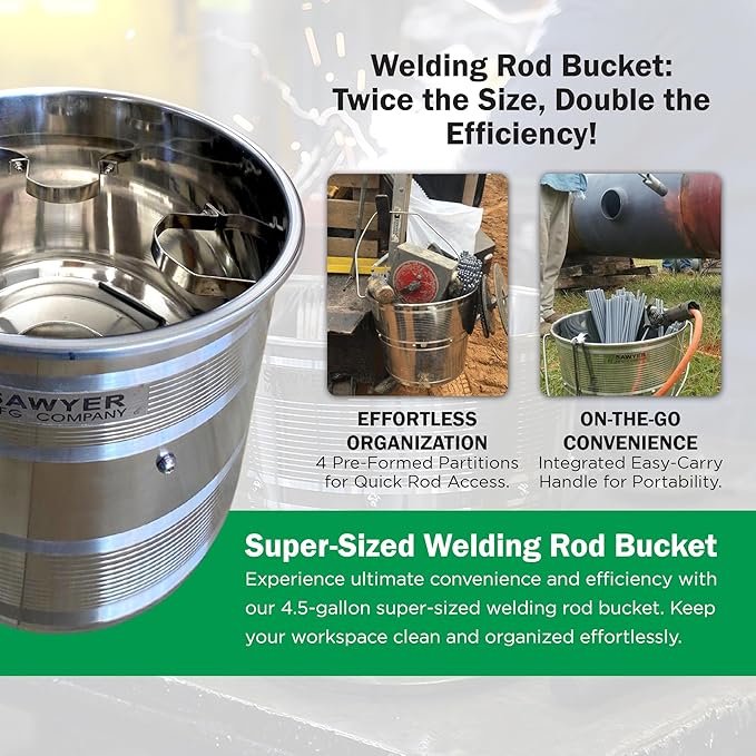 - WHAT MAKES THE BUCKET DURABLE AND LONG-LASTING? The Sawyer Welding Rod Bucket is built with heavy-duty stainless steel, designed to withstand tough work environments. Unlike galvanized buckets, stainless steel resists wear and tear, ensuring your investment holds up against the harshest conditions, giving you a reliable storage solution for years to come.