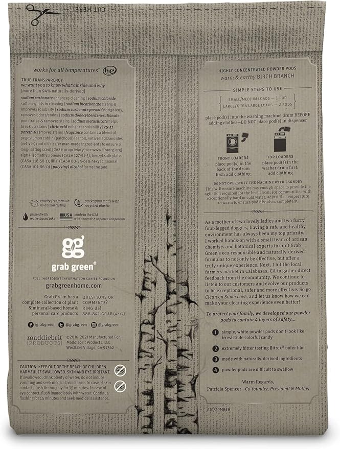 - Contains: 2- 50 Pod Bags of Grab Green Stoneworks Birch Branch Laundry Detergent Pods (100 Pods Total)