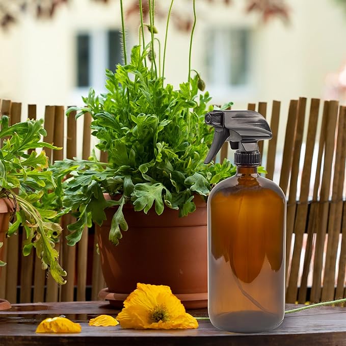 - AMBER GLASS BOTTLES: Glass bottles are safest for aromatherapy & essential oils to maintain their purity. Amber color provides protection to contents from ultraviolet light. VALUE 2-PACK: You get two 32-ounce amber glass bottles, 2 trigger sprayers with 3 settings, 2 spare lids for storage & transport