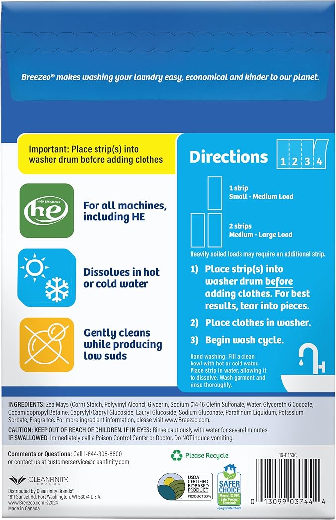 Breezeo Laundry Detergent Strips (48 strips) - Fresh Linen Scent - More Convenient than Pods, Pacs, Liquids or Powders – Great for Home, Dorm, Travel, Camping & Hand-Washing