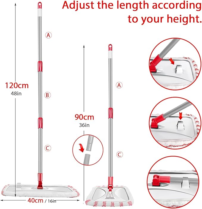- 【Ajustable Handle】The handle of microfiber broom can adjust to 50‘’ for cleaning high areas. The length of the floor mops also can be adjusted according to your height, so you need not bend down when cleaning the floor.