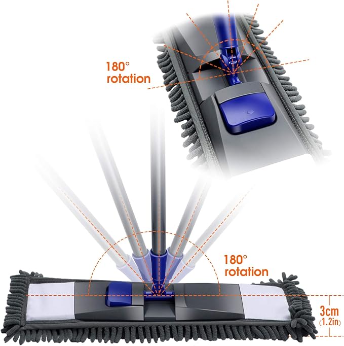 - 【Wet & Dry Floor Mop】:The dust mop comes with two type of materials which used in different scenarios. Chenille is suitable for dry mopping, and microfiber is suitable for wet mopping.Chenille mop pad has strong decontamination and water absorption ability.Microfibre head can grab dirt easily and won't drop everywhere.