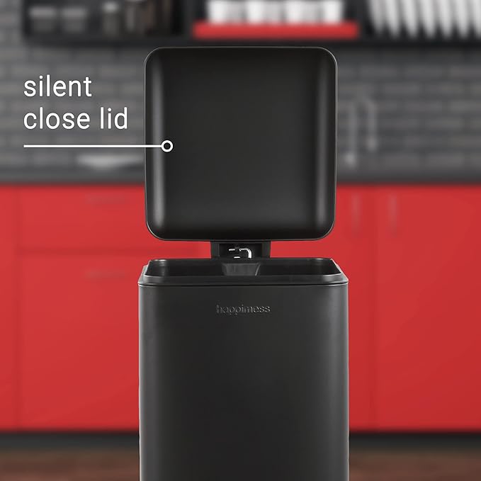 - STYLISH & PRACTICAL DESIGN: happimess Trash Cans clean-lined designs blend beautifully into your existing decor; Dispose of trash hands-free with our convenient step pedal; built-in damper lowers the lid quietly, and closes it tightly to keep odors inside