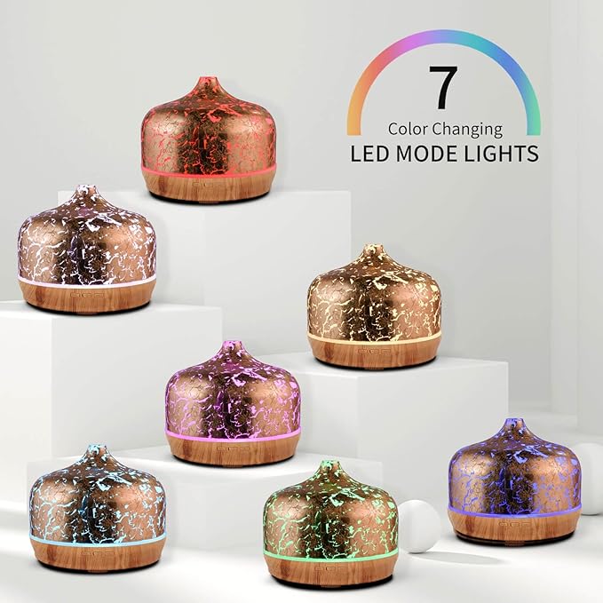 - UNIQUE ART DECORATIVE DESIGN - Our 500ml glass essential oil diffuser has an elegant gold plated glass cover and wood grain decorative base. It is very suitable for your bedroom, living room, children's room, study room, office and yoga room.