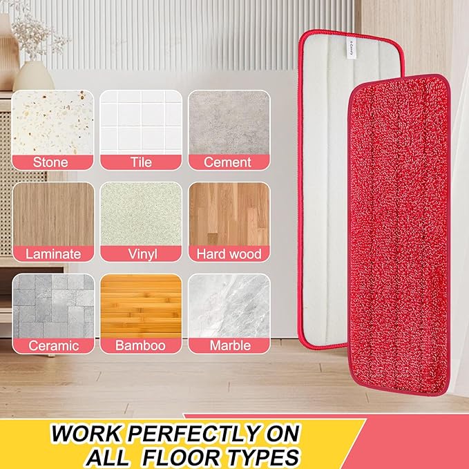 - SUPERFINE MICROFIBER - Our spray mop heads adopt the high quality microfiber whose decontamination ability is further improved, fully absorb pet fur, hair, debris, dust, oil or other stubborn stain, durable and reusable.