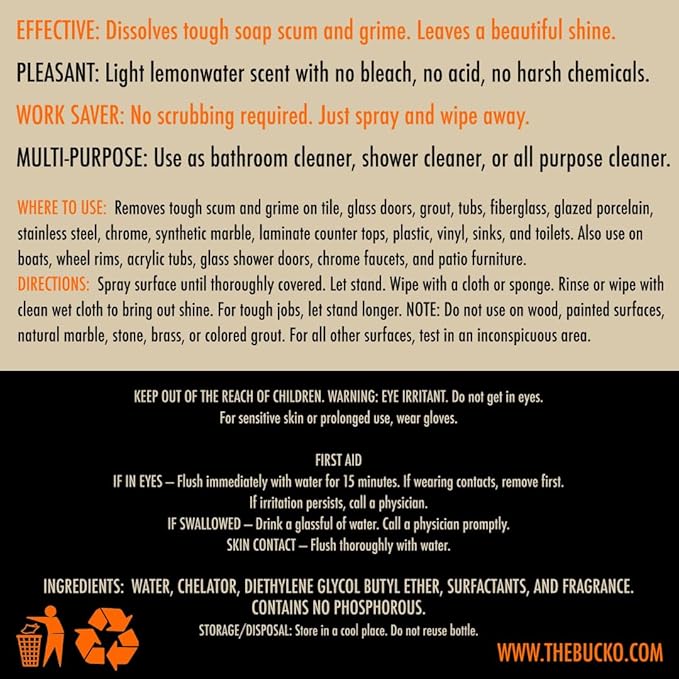 - πͺπ’π₯π π¦ππ©ππ₯: Scrub free cleaning. Just spray and wipe away soap scum. Let sit for tougher jobs. Leaves a beautiful, protective shine