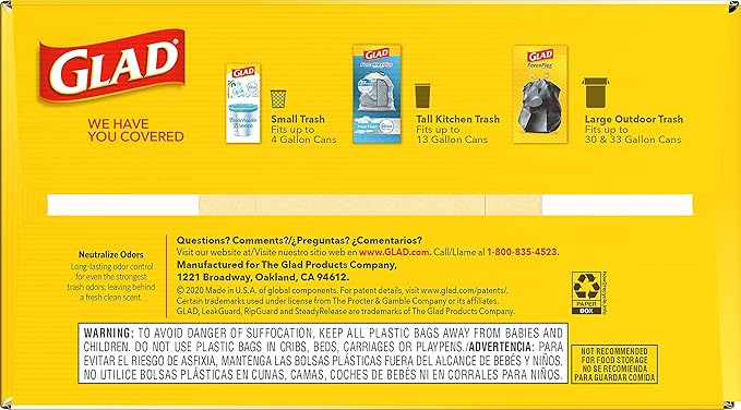 - FORCEFLEX STRENGTH: Glad’s trusted ForceFlex technology allows the bag to stretch and expand over heavy loads with sharp edges, delivering durable strength; packaging may vary