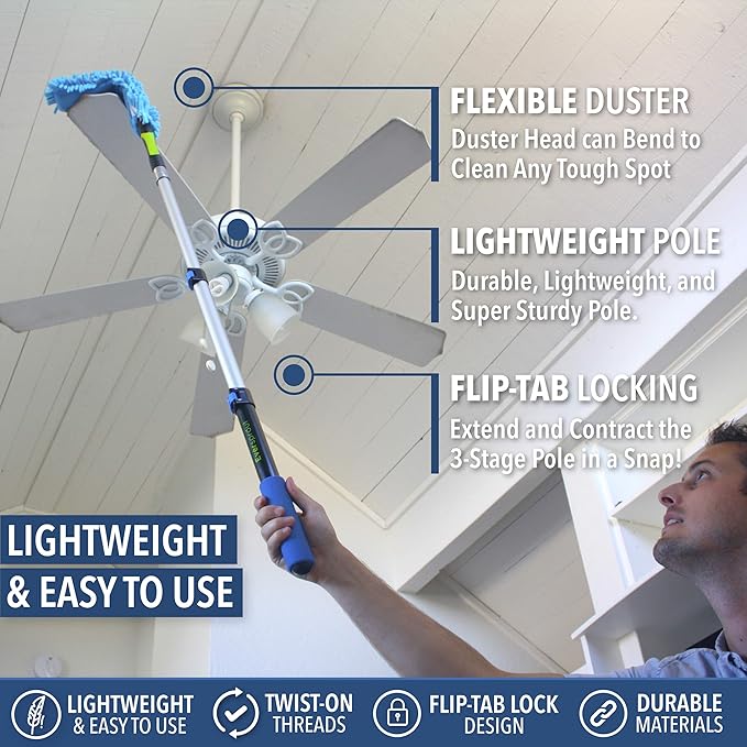 - SAVE TIME, SKIP THE LADDER – EXTENDS TO 4.5 FEET, REACH UP TO 8-10 FEET WHEN STANDING – Included is an Eversprout Extension Pole (1.5 to 3.1 ft), Cobweb Duster, Feather Duster, and Ceiling Fan Duster. All dusters twist onto the 3-Stage Aluminum Extension Pole & extends to any custom length from 1.5-to-4.5 Feet. Reach up to 8-10 feet when standing.