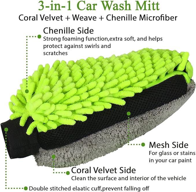 - 【3 in 1 Wash Mitt=Chenille + Coral Velvet + Weave】Chenille side is for car paint surface, interior parts and car paint waxing.Strong foaming function,good cleaning effect,extra soft, and helps protect against swirls and scratches;Mesh side is for glass or stains in your car paint;Coral velvet side, strong water absorption without leaving water marks, can be used to clean the car paint surface and interior cleaning materials under normal use