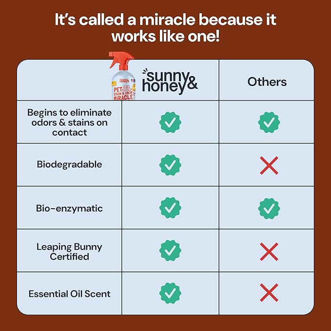 - Pet Cleanup Made Easy: With Sunny & Honey Pet Stain & Odor Miracle, cleaning up after your furry pals is a breeze. This enzyme cleaner for pets tackles dog pee and cat urine like a pro, leaving your home smelling fresh and inviting with a light fall spice aroma