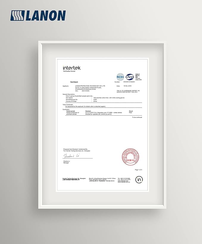 - CERTIFICATIONS - LANON industrial gloves for hand protection are certificated by CE 0075 CAT III, with Standards EN 388:2016, EN 420, EN ISO374-5:2016, EN ISO374-1:2016/Type A, and meet CA Prop.65 regulations for phthalates. It also passed the FDA regulation test.