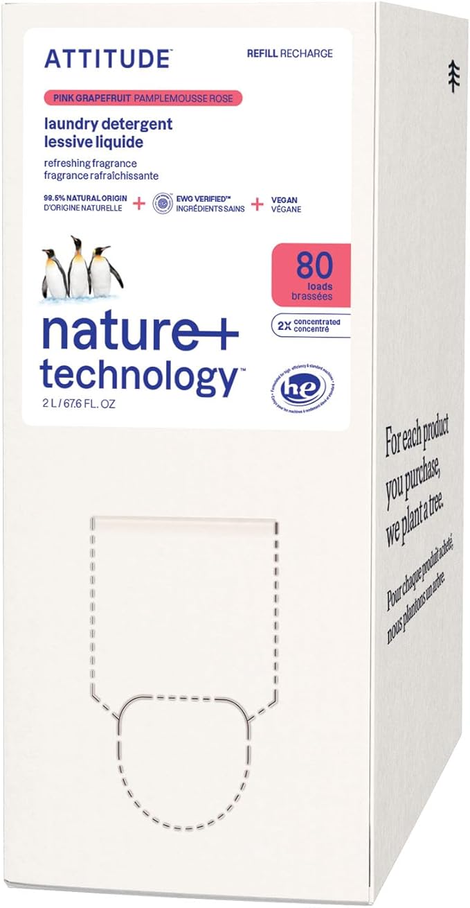ATTITUDE Liquid Laundry Detergent Refill, EWG Verified, HE Compatible, Plant-Based & Vegan, Natural Laundry Soap, Pink Grapefruit Scent, 80 Loads, 67.6 Fl Oz