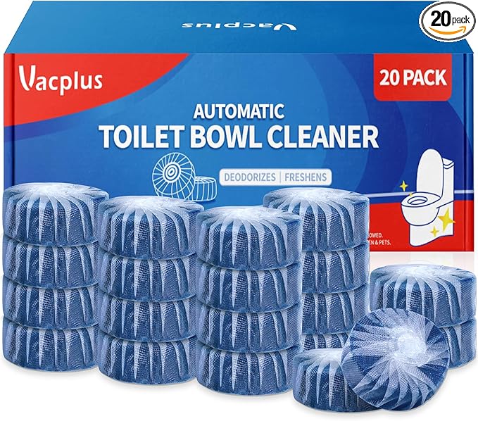 - LONG-LASTING EFFECT: With the sustained-release technology, each Vacplus splash toilet cleaner can continuously clean the toilet for up to 15 days with 20 flushes a day. With 20 packs for replacement, Vacplus toilet cleaner tablets can keep the toilet bowl clean and fresh for over 10 months. Additionally, the lifetime of each toilet tablet may vary with the frequency of flushes.