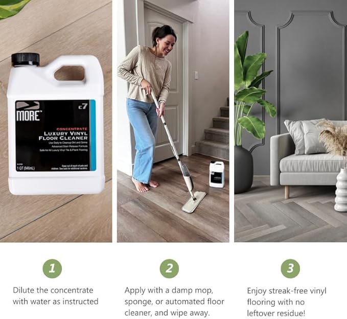 - CLEAN INGREDIENTS - Made with just a handful of plant-based ingredients, MORE Luxury Vinyl Floor Cleaner is light and unscented. Our water-based formula has less impact on indoor air quality so it can be used worry-free on floors throughout your home or office space.