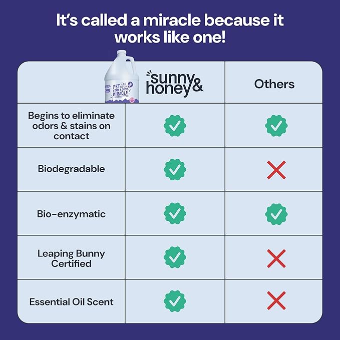 - Sunny & Honey Magic: Say hello to Sunny & Honey's Pet Stain & Scent Miracle for keeping your place fresh and inviting. This pet carpet cleaner solution is perfect for dealing with dog pee and cat urine while leaving your home smelling wonderful