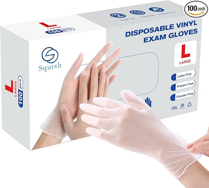 squish Disposable Gloves, 100 Count 4 mil Clear Vinyl Gloves Latex Free Powder-Free Health Glove Cleaning Rubber Glove for Kitchen Cooking Cleaning Food Handling, Large