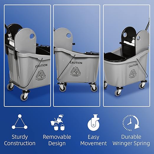 - 9.5 Gal / 36 L Capacity: This mop bucket with mop-handle holder and wheels offers a commercial-grade cleaning solution for use at home. Note: Mop not included.