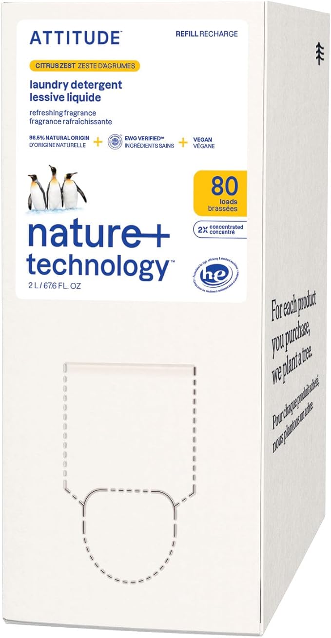 ATTITUDE Liquid Laundry Detergent Refill, EWG Verified, HE Compatible, Plant-Based & Vegan, Natural Laundry Soap, Citrus Zest Scent, 80 Loads, 67.6 Fl Oz