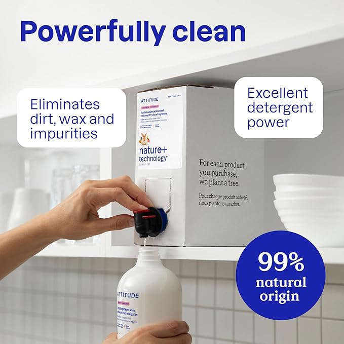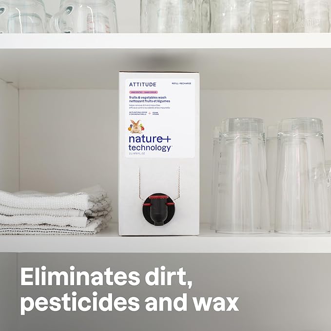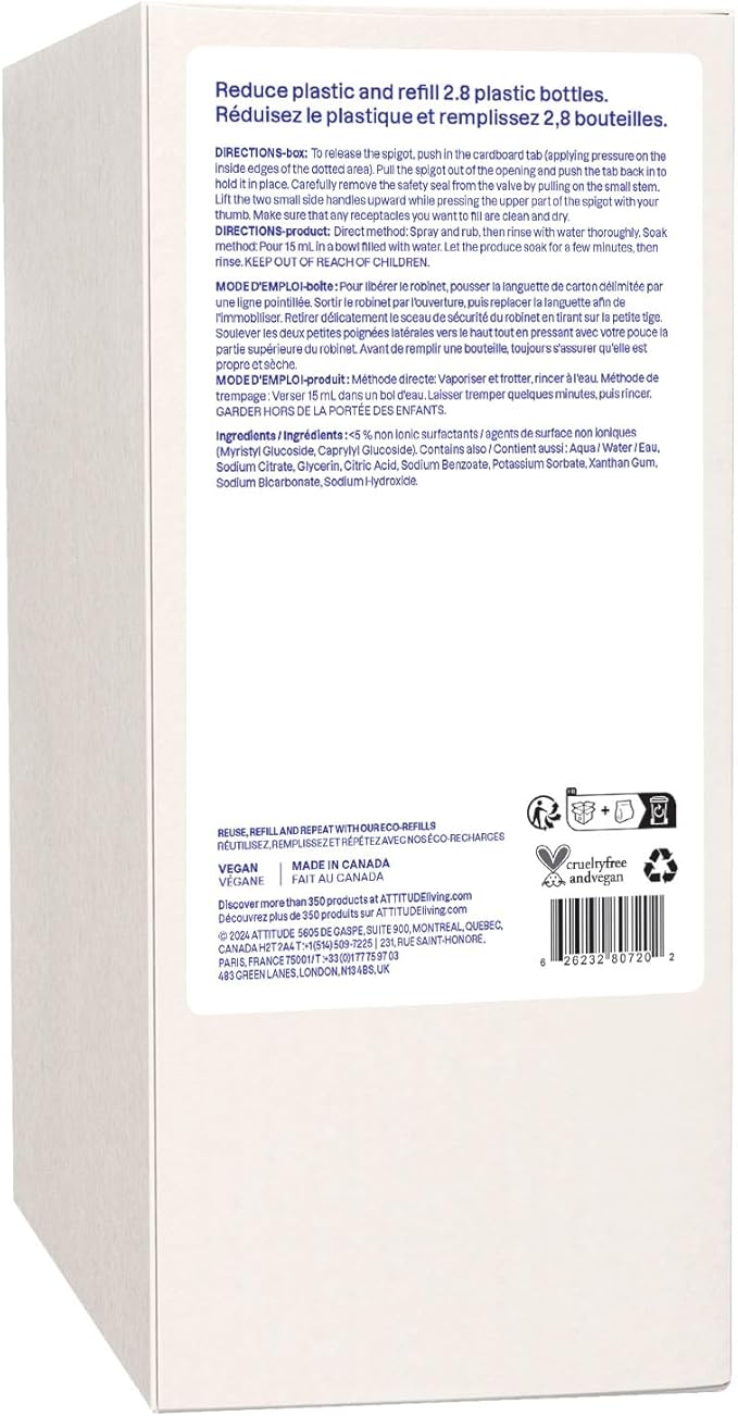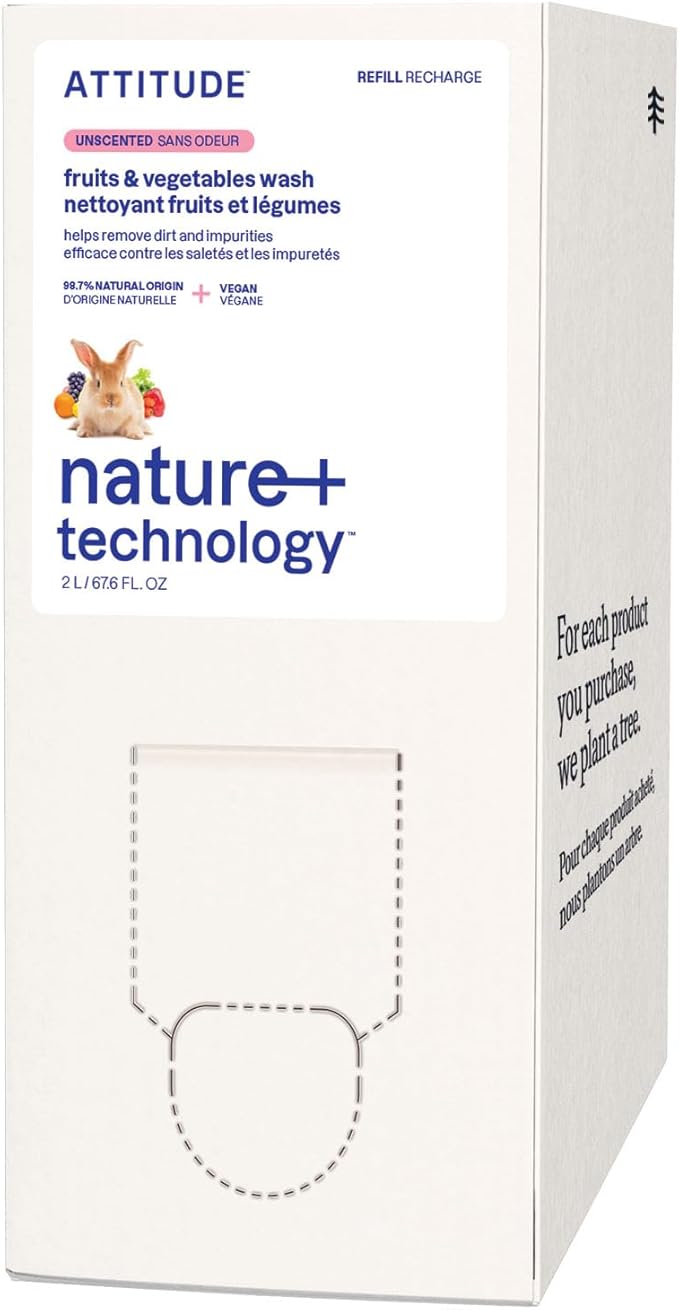 ATTITUDE Fruit & Vegetable Wash Refill, Food-Safe Produce Wash, Removes Dirt & Residue, Vegan & Plant-Based Ingredients, Unscented, 67.6 Fl Oz