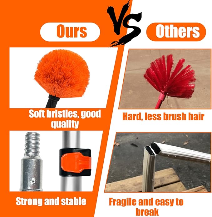 - SPIDER WEB BRUSH HEAD - Bristles are soft, this outdoor web brush can easily delicate dusting and clean the pesky spider webs. Maximizes the dust attraction of the cobweb cleaner and enables it to penetrate corners, crevices, uneven spots and other tight areas, totally scratch free.
