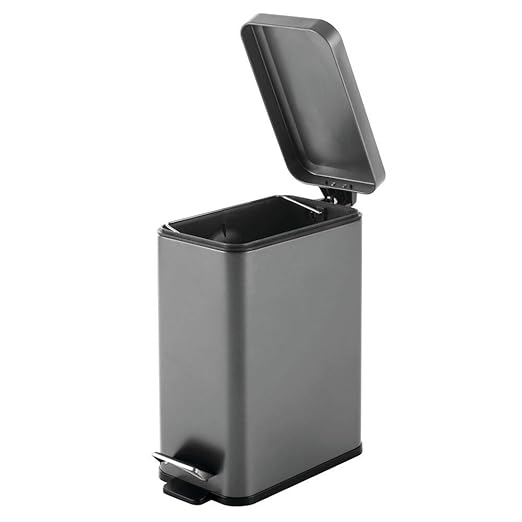 mDesign Pedal Bin — Waste Bin with Pedal, Lid and Plastic Bucket Insert for Bathroom, Kitchen, and Office — Metal Household Rubbish Bin with Ergonomic Design — Dark Grey