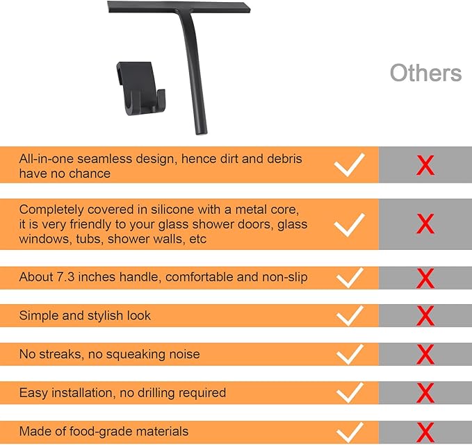- 【seamless and sleek design】Shower glass squeegee, completely seamless and smooth surface can prevent dirt settling, no metal parts rust or scratch the surface. The matte of black finish is suitable for any modern or traditional bathroom decoration