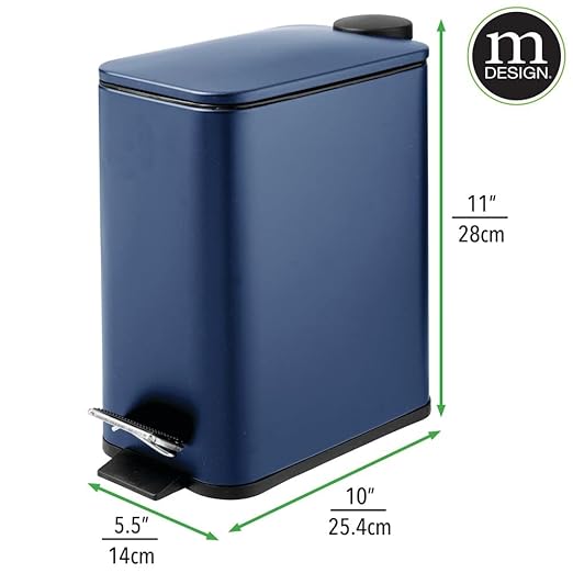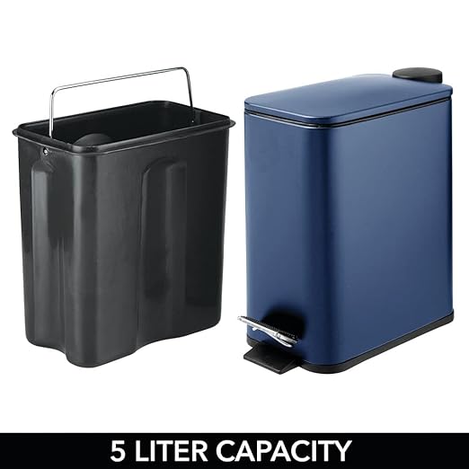 mDesign Rectangular Pedal Bin – 5 L Metal Waste Bin with Pedal, Lid and Plastic Bucket Insert – Household Rubbish Bin for Bathroom, Kitchen and Office – Navy