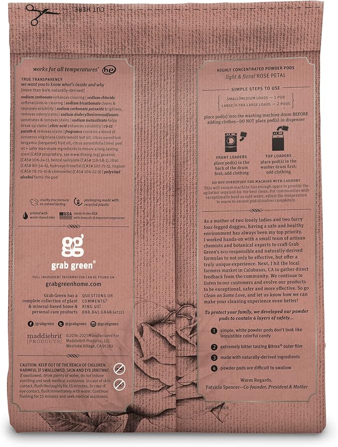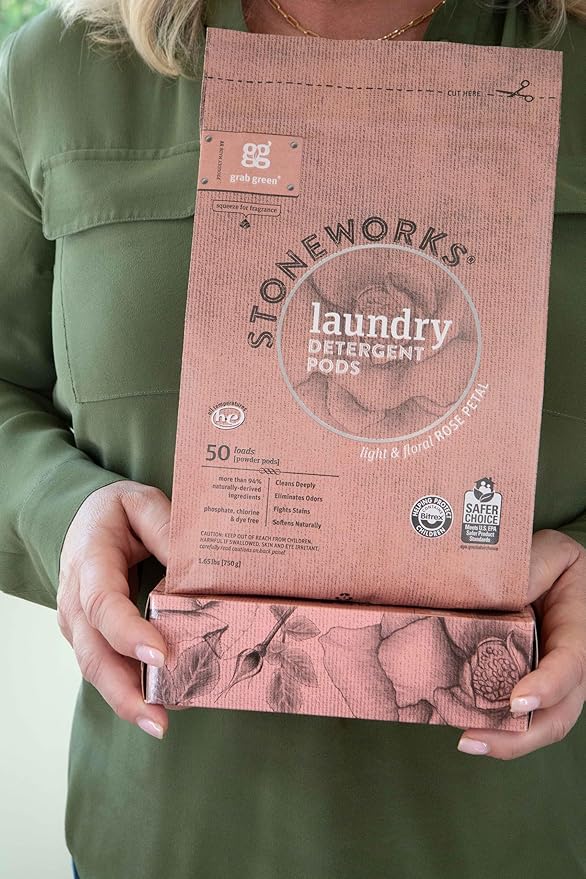 - Contains: 1- 50 Pod Bag of Grab Green Stoneworks Rose Petal Laundry Detergent Pods and 1- 80 Sheet Box of Grab Green Stoneworks Natural, Compostable Rose Petal Dryer Sheets
