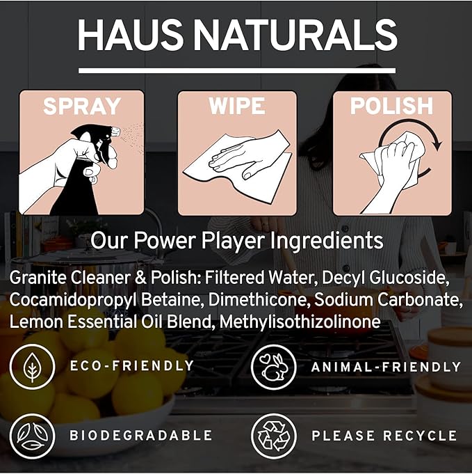 - ✅ DAILY HAUS Naturals Granite Cleaner + Polish cleans and protects all your stone surfaces including: granite, marble, quartz, onyx, slate and any non-porous countertop. Our powerful cleaner dissolves grease, oil, and grime while leaving behind a brilliant mirror-like finish.