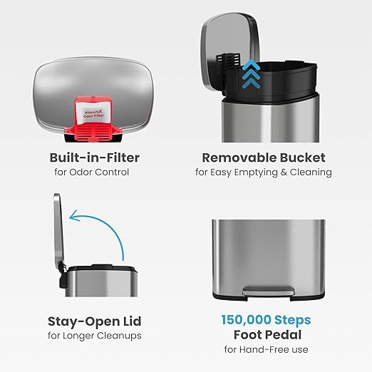 - MOST POPULAR STAINLESS STEEL KITCHEN TRASH CAN + ODOR CONTROL - OUR PROMISE TO YOU – Your 100% satisfaction on our kitchen trash can 13 gallon is assured; backed by Full-Service Manufacturer's Warranty and Dedicated Customer Support (see user manual)