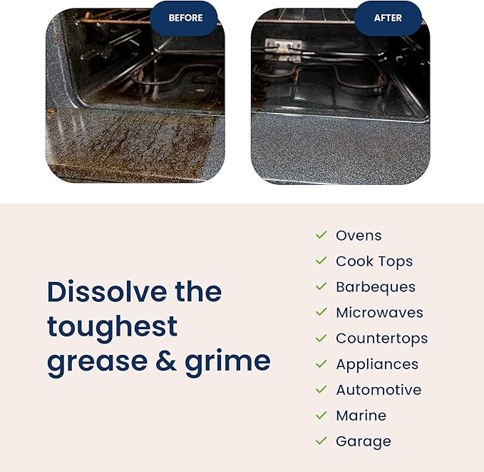 - VERSATILE CLEANING POWER: Whether you need to tackle grease and grime on ovens, cooktops, barbeques, and microwaves, or maintain the cleanliness of countertops, appliances, sinks, and bathtubs, this powerful cleaner has you covered. It’s not just for the kitchen—use it in your garage, on your automotive surfaces, marine equipment, and RVs to remove stubborn dirt and grease with ease.