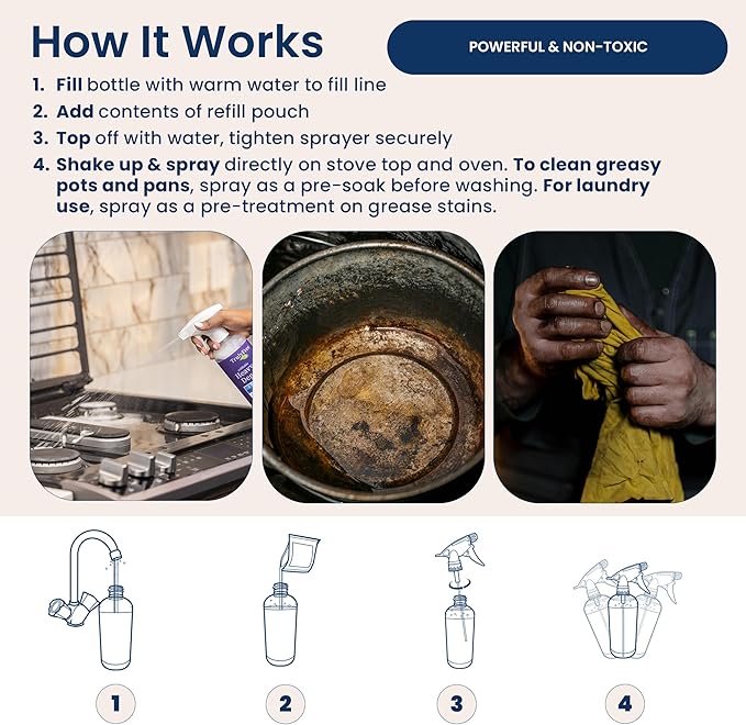 - EASY TO USE: Simplify your cleaning routine with our heavy-duty degreaser. For kitchen appliances, simply spray and wipe your stovetop and oven. To clean greasy pots and pans, use it as a pre-soak before washing. For laundry, spray as a pre-treatment on grease stains. Enjoy effortless cleaning with powerful results.
