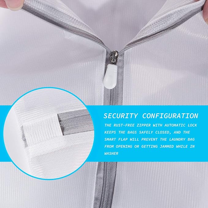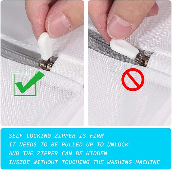 - 【Auto-lock Zipper】: This zipper laundry mesh bag has a high quality zipper with a side cover,it is aoto-locked zipper can prevent the delicate laundry wash bag opening when it running,and the side cover can protect your washing machine,avoid the matel zipper scratch the machine and also extend the service life of zipper.