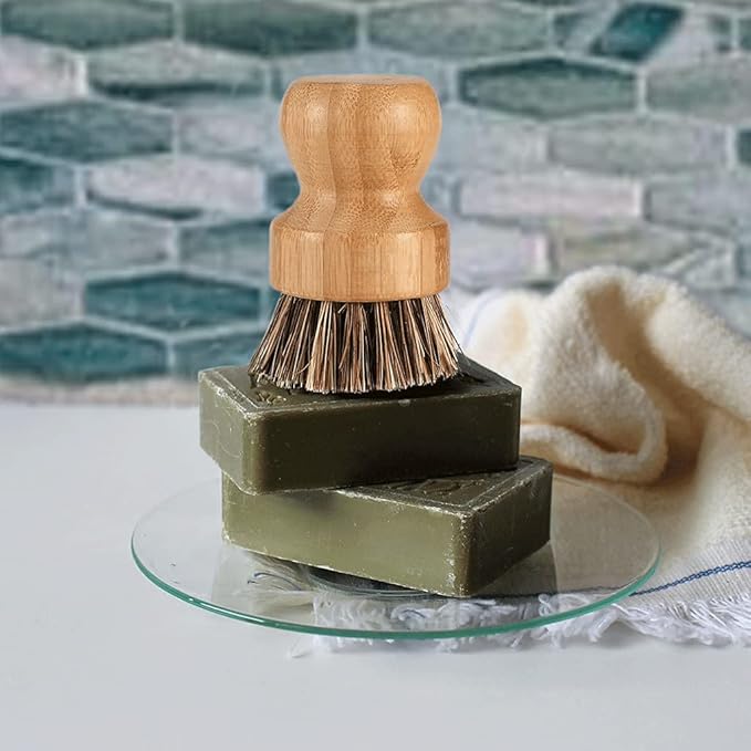 - Natural & Heat-proof Bristles - The set comes with 2 brushes which is with brown bristles are made from very stiff palm union fibers. Ideal for cleaning cast iron, pan and pot, perfect for removing dried food off plates before putting in dishwasher. The other 2 brushes are with white bristles are made of medium stiff Tampico /sisal fibers, suitable for delicate dishes and non-stick cookware. These brushes can use with any detergent, very safe to use in hot water without damaging the bristles.