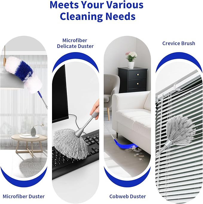 - Wide Applications: The dusters with extension pole are suitable for many occasions, such as walls, fans, vents, high ceilings, ceiling fans, bookshelves and so on. Great tool with multiple cleaning accessories for out of reach places.